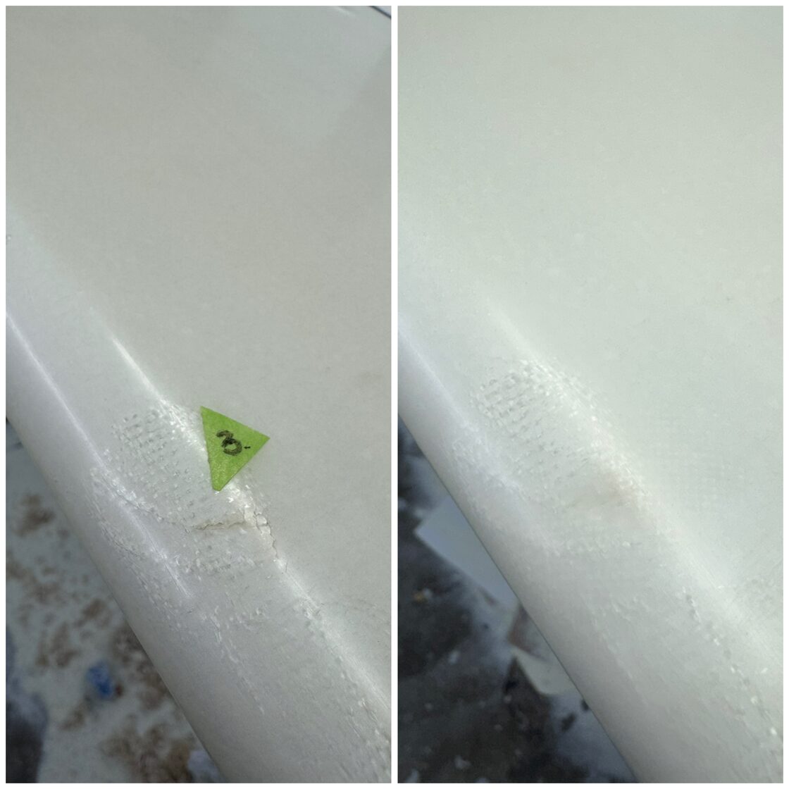 When the surfboard's fiberglass skin separates from the inner foam core, creating a soft, bubble-like area on the board's surface50,-