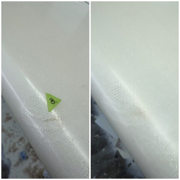 Kad sērfošanas dēļa stiklšķiedras apvalks atdalās no iekšējā putuplasta, uz dēļa virsmas izveidojot mīkstu, burbuļveida laukumu
